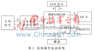 通过以标准导联方式I和人体相连的电极取得的心电信号,因为环境中存在各种干扰(人体自身的肌电干扰,外部的工频干扰等),所以必须经过模拟放大电路的放大、滤波等调理之后才可进入MSP430F169单片机,利用单片机内部的A/D模块对模拟信号进行模数转换,然后存储数据,并在液晶屏上显示,观察者可以直观地看到心电信号波形和每分钟心跳的次数。系统采用SD卡来存储采集的数据,采集的心电信号数据可以长时间存储,这对于心电信号异常且有偶发性的病人具有重要价值。系统还可以通过串口把采集的心电信号实时传输到上位机,由上位机显示并进行实时分析。