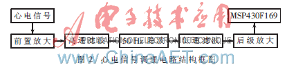 心电信号调理电路是本系统的重要环节之一,主要由前置放大、高通滤波、50 Hz陷波、低通滤波和后级放大电路组成,如图2所示。因为体表ECG心电仪一般只有0.05 mV~5 mV,具有微弱和易受干扰等特点, 因此,采用高输入阻抗、高共模抑制比的差分放大电路进行前置放大,以增大输入阻抗、减少共模信号干扰;带通滤波电路主要由高通滤波器和低通滤波器组成,通频带为0.5 Hz~100 Hz,滤除心电频率范围以外的干扰信号;50 Hz 陷波处理器滤除工频干扰;后级放大器将ECG信号进一步放大100倍左右到合适范围,然后输出到核心控制器MSP430F169的A/D模块。
