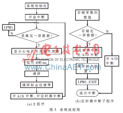 系统流程图如图5所示。首先系统进行初始化(包括看门狗、系统时钟、I/O口、UART1、ADC12、TimerB及LCD等初始化),开总中断后系统进入主循环体,当采集满一屏数据时,主循环体内进行心电波形的刷新显示;不满一屏数据时,进入低功耗状态。A/D采集用中断方式,系统的采样频率通过定时器控制,5个独立按键采用中断方式,通过软件延时消除按键抖动。