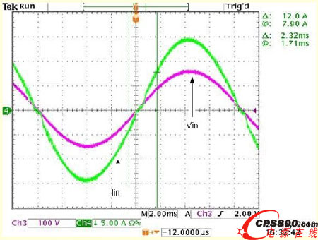 图5 低压线路的VIN和IIN波形(VIN=110V,负载=1100W,THD=2.23%,PF=0.998)