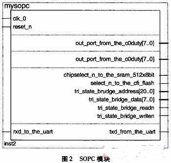 首先简单介绍Avalon总线。SOPCBuilder自动生成的Avalon交换架构是针对系统处理器和外设的专用互联需求进行优化。Avalon总线可以连接许多外部设备,如定时器/计数器,外部三态桥接,外部SRAM接口,UART,LCD接口,用户逻辑接口JTAG,UARTC,并行I/O等。代码中,IOWR_ALTERA_AVALON_UART_STATUS()函数可以完成向串口发送数据的任务,IOWR_ALTERA_AVALON_PIO_DATA()函数则可以给内部工程发送并行数据,控制占空比的值。