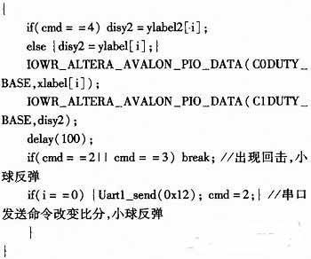 该段程序是主函数main()的关键部分,其中数组xlabel[50]是小球在X轴方向的运动轨迹,轨迹方程是xlabel=i×5。数组ylabel[50]和ylabel2[50]是小球在Y方向的两个轨迹,轨迹方程分别为ylabel=-0.007i2+1.792i和ylabel2=-0.013i2+3.328i,其中i是小球运动的变量,在for循环函数中匀速增加或减小。当出现break时小球运动方向改变。当i=0或者i=49时,说明小球触壁却没能遭到有效击球,判定一方得分,通过UART发送指令在单片机上显示比分。delay()函数用来控制小球的运动速度。