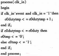 每当输入时钟clk_in变化时进程被触发。在进程中,每一个时钟上升沿计数器变量c0dutytmp加一,在一个周期内,计数器小于预设值时输出低电平,大于预设值时输出高电平。在设计中,我选用的预设值为8位,所以在0到255之间给定任意一个数作为输入就可以设置它的占空比。占空比。而通过SOPCbuilder生成的SOPC控制c0duty便可以间接控制其占空比。以上代码完成了一条通道的控制,另一个数据通道方法类似。