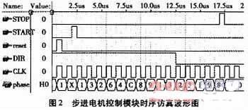 从图2中可以看到,在模拟步进电机启动、停止、正反转时电机的状态。比如在复位后当START=‘1’时,如果这时DIR=‘1’表示电机是正转,则电机的通电状态是A—AB—B—BC—C—CD—D—AD,对应的CPLD的输出状态就为S0~S7。当DIR=‘0’时表示电机是反转,就图2的截图来说在CLK的上升沿时,输出是状态S2,因为它的前一个状态从图上我们可以看出是S1。