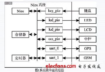 系统硬件组成框图由Nios系统和外部设备两部分组成,如图1所示。