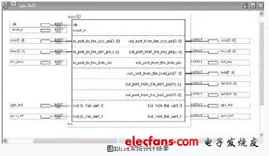 Nios系统包括CPU(Nios)、存储器(memory)、定时器(timer)、总线和并/串行接口(key_pio、led_pio、lcd_pio、ccs_pio、uart_0和uart_1)等,并/串行接口分别实现与键盘、LED和LCD显示器、汽车中控系统以及GPS和GSM系统等外部设备的连接。Nios系统设计和设计结果分别如图2和图3所示。