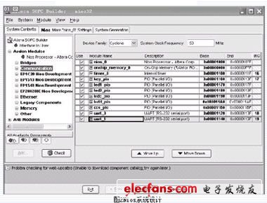 设计采用Altera公司的SoPC开发工具。系统的开发包括硬件和软件两大部分。使用SoPC Builder生成Nios嵌入式处理器,Nios嵌入式处理器开发工具允许用户配置一个或多个Nios CPU,从标准库中添加外围设备,综合处理自定义系统,与Quartus II设计软件一起编译系统。软件开发的步骤是:利用SoPC Builder生成的软件文件,用文本编辑器编写汇编语言或C/C++源程序,用GNUPro软件开发工具进行程序设计、连编和调试。GNUPro将源程序连编(包括汇编/编译和连接)成可执行程序,通过下载电缆对可执行程序进行调试和运行。Quartus II设计软件提供全面有效的设计环境,将设计、综合、布局和验证以及第三方EDA工具接口集成在一个无缝的环境中。利用集成在Quartus II 3.0中的SoPCbuilder可以创建自己的Nios CPU系统。Nios是Altera公司开发的16/32位嵌入式处理器软核。
