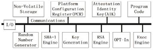 可信计算的核心是TPM,它是一种安全加密芯片,提供了一种基于硬件的方法来管理用户权限、网络访问、数据保护等。TPM芯片用来存储数字密钥、认证和密码,有了TPM不管是虚拟的还是物理的攻击都将变得更加困难。如图1所示,TPM芯片主要由以下几部分组成:I/O组件、非易失性存储、身份密钥、程序代码、随机数产生器、Sha-1算法引擎、RSA密钥产生、RSA引擎、Opt-In选择组件、执行引擎。