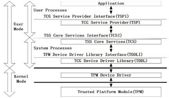 TSS由三个逻辑组件构成:TCG设备驱动程序库(TCG Device Driver Library,TDDL)、TSS核心服务(TSS Core Services,TCS)、TCG服务提供者(TCG Service Provider,TSP)。