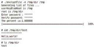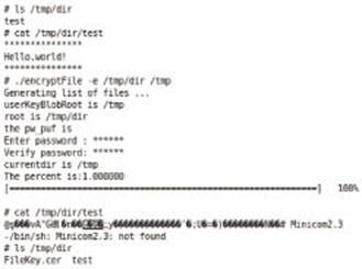 加密之前,/tmp/dir目录下只有test一个文件,使用cat命令查看该文件的内容为:Hello,world!执行加密命令之后,使用cat命令再次查看该文件的内容,看到的是乱码,而不是原始内容,可见加密成功。加密后在test文件所在的目录下会生成一个FileKey.cer文件。如图6所示: