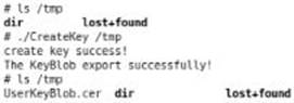 创建密钥之前/tmp目录下的文件只有dir,创建成功后会打印信息,并生成密钥文件UserKeyBlob.cer,如图5所示: