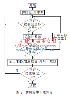 单片机T0口接收到脉冲下降沿后,T0计数器计数,下一次下降沿触发计数器停止,并把结果存在预先设置好的数组中。数组里面的数字代表一个信号的长短。虽然不同厂商的红外遥控器编码形制不同,但在所有的编码中,0、1信号只有长度的区别。根据这个原理,对采集到的信号组进行分析,定义长的信号为1,短的信号为0。反复实验就得到各个按键的编码,破解后的遥控器可以用作单片机的扩展键盘。图3为解码程序主流程图。