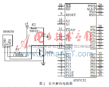 红外解码电路如图2所示,当HS0038接收到红外信号时,输出端输出脉冲,触发三极管导通,发光二极管通电发光[3],这样可以直观地看到发射、接收部分是否正常工作。输出端接AT87C52单片机的T0口,下降沿触发T0计数器计数[4]。