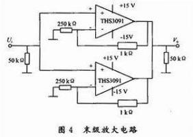 末级放大电路由THS3091 D构成,THS3091D是高输出电压低失真的电流反馈运算放大器。具有特点是:高带宽(210 MHz,G=2,RL=100 Ω);高输出驱动电流(250 mA);低失真、低噪声;高供电电源范围(5~15 V);信号从同相端输入,增益为1+1 000/250=5倍。输出采用两个THS3091并联的方式,增加驱动能力。如图4所示。