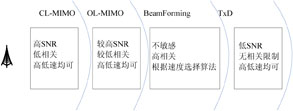 发送分集发射方式对信道条件要求不高,对SNR,信道相关性,移动速度均不敏感。但是该发射方式无法获取空间并行信道带来的速率红利,发送分集方案不能提高数据率。当信道间相关性大且SNR较低或移动速度过高情况下(对应无线信道条件差),会考虑切换到发送分集的发射方案,例如信道恶化的场景下。当信道处于理想状态或信道间相关性小时,发射端采用空分复用的发射方案,例如密集城区、室内覆盖高SNR条件等场景。