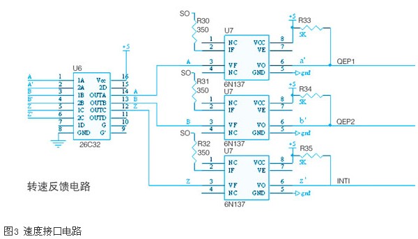 由于26c32可以同时接受四路信号,所以,a、b、z、a’、b’、z’信号可以同时与26c32的ina1、ina2、inb1、inb2、inc1、inc2端相连,输出端outa、outb、outc端分别接到光耦6n137芯片上输出再与tms320f2812的qep1、qep2、int1相连,以完成转速环节的接口电路。