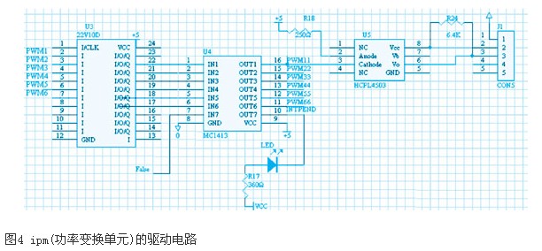 ipm的驱动隔离电路如图4所示。尽管在lf2407a输出的pwm中已经加入了死区时间,本系统设计中依然从硬件方面采取措施,如图4所示,gel器件22v10d在lf2407a之后,保证同一相的上、下桥臂的互锁。为了增强驱动信号的带负载能力,在22v10d的输出之后串入一片缓冲器——mc1413。当驱动信号发生错误,lf2407a发出一个错误信号false,并点亮发光二极管ledintpend。缓冲器mc1413的输出经过快速光耦hcpl4503隔离,驱动ipm。图中只画出了a相上桥臂的电路,其他桥臂的电路与此相同。hcpl4503下面的光耦til117的一次侧接到ipm的故障输出引脚5上。