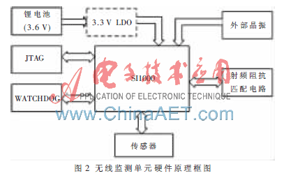 无线监测单元的硬件电路原理如图2所示,主要由电源、看门狗电路、无线射频匹配电路、传感器电路和SI1000单片机构成。