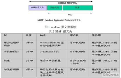 Modbus TCP 只是在 TCP/IP 协议的基础上进一步进行了modbus 报文的封装,其数据帧 如图1 所示,包含了报文头,功能代码和数据三部分,其中MBAP 报文头各域及所占字节长 度如表2 所示。