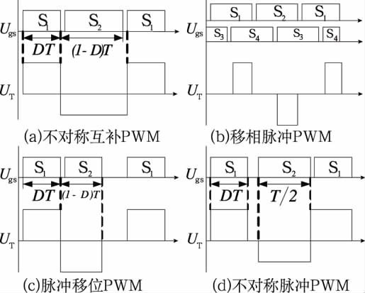 控制型软开关半桥DC/DC变换器不增加主电路元器件(可增加电感电容元件以实现软开关条件),通过合理设计控制电路来实现软开关。图1给出4种控制型软开关半桥DC/DC变换器的PWM 控制策略。