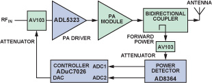 图6给出了自动功率控制回路的功能框图,该回路包含双向耦合器、TruPwr检测器、微控制器和可变电压衰减器。双向耦合器把前向功率传送到TruPwr检测器,检测器跟踪信号幅度的变化。ADuC7026的片上ADC对检测器的输出采样。微控制器比较输出功率的实际值与期望值,并使用PID算法来调整控制电压偏差,使功率放大器工作在性能最佳的工作点上。