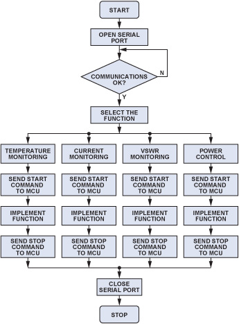 UI主要用来提供人机交互界面,实时显示检测数据,并响应操作员的输入命令。图8给出了用户界面程序的流程图。程序运行后,首先要打开串行端口并启动通讯链接。然后,可以选择各功能模块进行监测和控制。