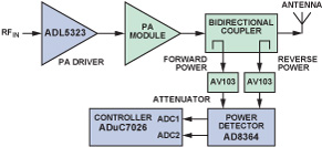图5:VSWR监测器功能框图。自动功率控制 :根据通信系统的要求,发射机必须确保功率放大器能满足发射的需要,调整基站发射功率保持在精准值,控制输出功率在覆盖允许范围内,不至过小无法满足网络规划时的覆盖距离要求,而减少小区覆盖范围,又不会产生过强的输出信号对相邻基站造成干扰。由于过功率会引起功率放大器饱和并使信号发生非线性失真,系统应提供过功率保护功能,保证功率放大器不工作在过功率条件下。基于上述原因,必须对输出功率进行测量和控制以使之保持稳定。