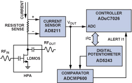 图4给出了电流监测器的功能框图。该系统使用AD8211高压高精度分流放大器来采集PA模块中两个LDMOS级的漏极电流。AD8211的增益为固定的20V/V,在整个工作温度范围内的增益误差为±0.5%(典型值)。AD8211缓存的输出电压直接输出到模数转换器,由ADuC7026的片上ADC进行采样。漏极电流阈值由AD5243数字电位计设定,ADuC7026通过I22C总线对AD5243进行控制。系统根据ADCMP600比较器的输出来判定漏极电流是否超过或低于阈值。如果漏极电流超过阈值,系统点亮相应的LED向操作人员报警。