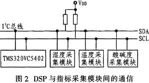 系统设计中TMS320VC5402作为主控制器,与每个指标采集部分通过I2C总线进行通信。I2C总线是由Philips公司开发的一种总线系统,它完成8位并行口到I2C总线协议的转换,使一些没有I2C接口的控制器可以直接接到I2C总线上进行通信。在系统中,TMS320VC5402设置为主机模式,每个指标采集部分设置为从机模式。这样,便于增加其他的指标采集模块,可直接“挂”在I2C总线上,如图2所示。