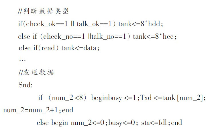 随后进入数据接收或发送状态,每个数据包接收完毕后逻辑处理模块进入下一状态--数据校验状态。根据上文提到的本设计的数据校验采用和校验,数据校验完后逻辑处理模块会根据校验结果给出信号check,通知发送模块Txd发送反馈信息给PC机。