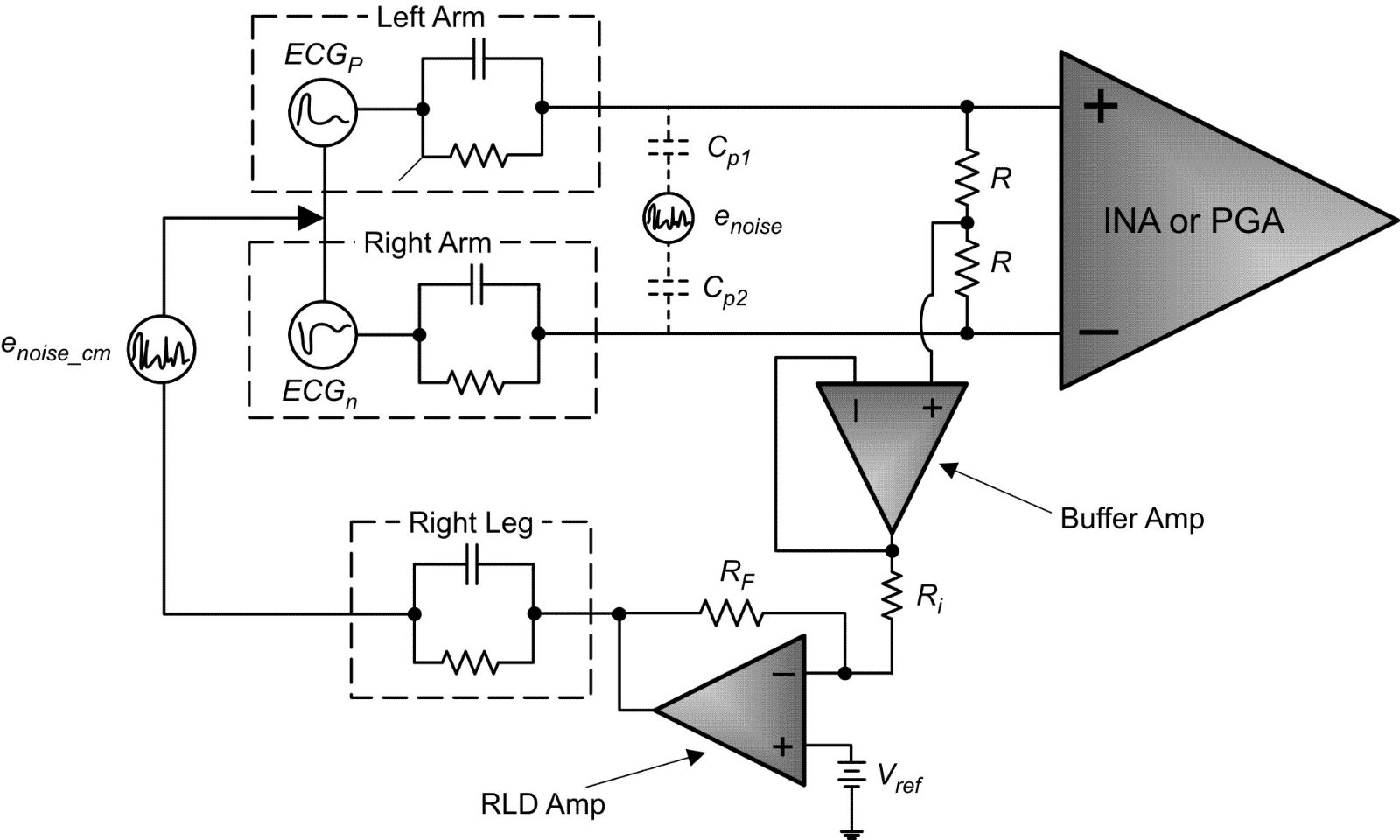 在 ECG 前端中,RLD 放大器具有 Vref 的共模电极偏置,并反馈经过反相处理的共模噪声信号 (enoise_cm),以降低测量放大器增益级输入端总噪声。图 1 中,源 ECGp 和 ECGn 被分离开,目的是表明 RLD 放大器如何为一部分 ECG信 号提供共模参考点,而这一部分 ECG 信号可在测量放大器 (INA) 的正负输入端看到。左臂、右臂和右腿的并联 RC 组合,代表了集总无源电极连接阻抗(本文后面部分以 52kΩ 和 47nf 表示)。假设 enoise 以寄生方式耦合至输入,则 enoise_cm 的反馈会降低每个输入端的总噪声信号,并使用外部方法过滤剩余噪声,或者利用测量放大器的共模抑制比 (CMRR) 来对其进行抑制。