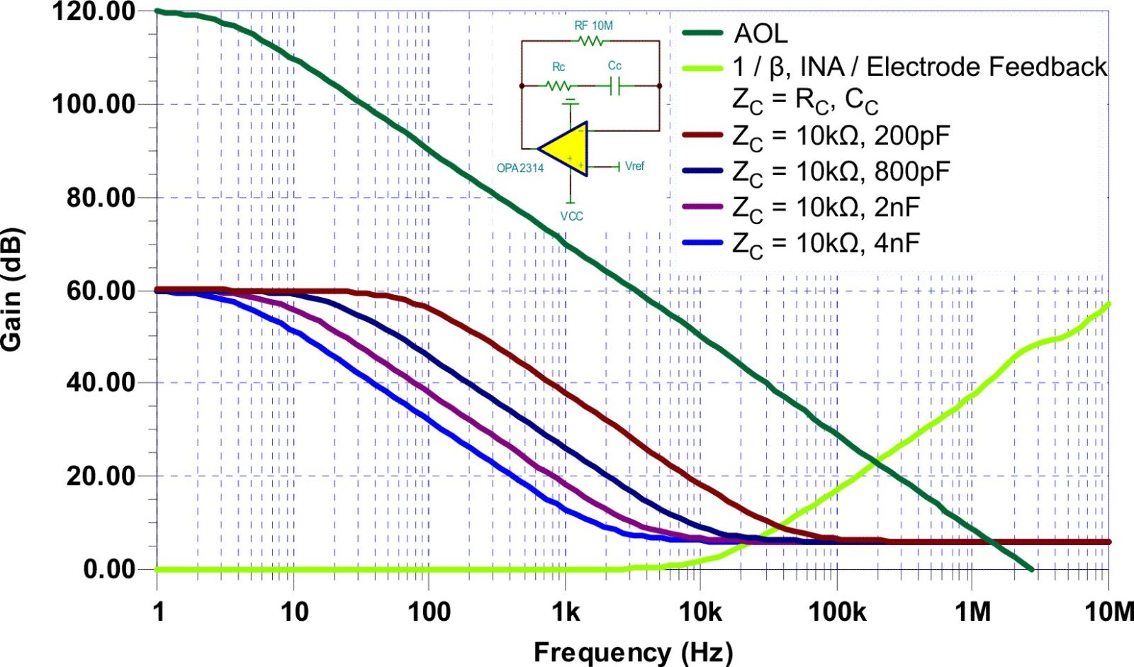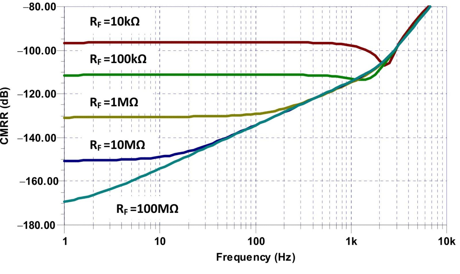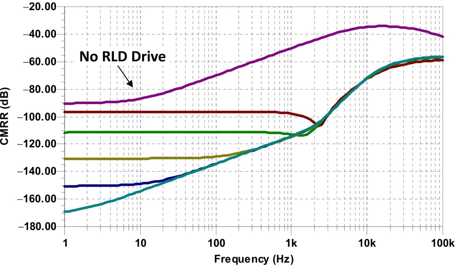 在图 2、3 和 4 中,我们可以看到共模抑制变化情况,表明共模测试电路具有不同的RLD 放大器增益。这些图表明,无反馈电阻器(即增益无限)时达到最佳低频 CMRR;但是,在现实世界中,对于那些要求在某条输入放大器引线被拔掉后 RLD 放大器仍能线性运行的应用来说,去除 DC 通路和/或将 RF 设置为某个高值或许并不实际。