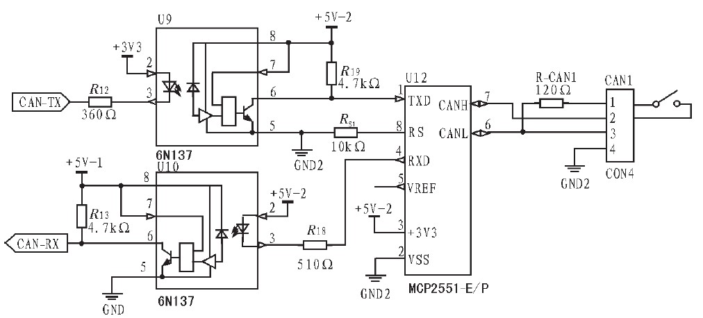 图2 耦隔离和CAN总线驱动器电路