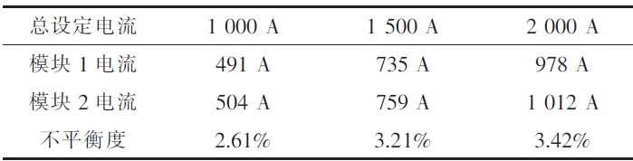 实验系统包含2个1 000 A/15 V的功率模块,系统在总设定电流下以稳压模式运行,测得表1中实验结果数据。
