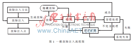 故障注入技术就是按照选定的故障模型,用人工注入的方法有意识地产生故障并施加于运行的目标系统中,达到加速该系统错误和失效的产生,通过监控并采集系统对注入故障的反馈信息和现场数据,通过分析提供有关结果的测试过程[5]。一般故障注入流程如图1所示。