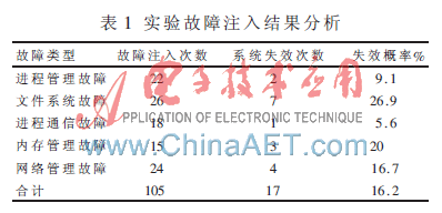实验中利用故障注入方法对Linux内核进行API调用的鲁棒性测试,将其API划分为进程管理、进程通信、文件系统、内存管理、网络管理这五方面。测试环境:宿主机为DELL的DIMENSION 4700,操作系统为Windows xp-sp3;目标机为友善之臂的ARM开发套件,系统为基于ARM移植的Linux系统,内核为2.2.24。整个故障注入测试过程是:在宿主机上选择故障注入测试项,根据不同API调用对象生成所需参数,然后将上述测试信息传递至目标系统。在目标系统上,根据接口信息要求生成测试任务项。根据故障注入对象选择故障注入方法,根据接口信息中的参数进行故障注入,将收集到的测试结果返回至宿主机进行结果分析[10]。在实验中采用GNU的调试工具GDB观察目标机系统内存和寄存器的值,利用文件系统观察测试数据信息,使用串口打印信息进行调试。通过这些方法监视系统状态,并进行多次试验观察。表1 为实验故障注入结果分析。