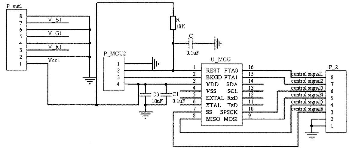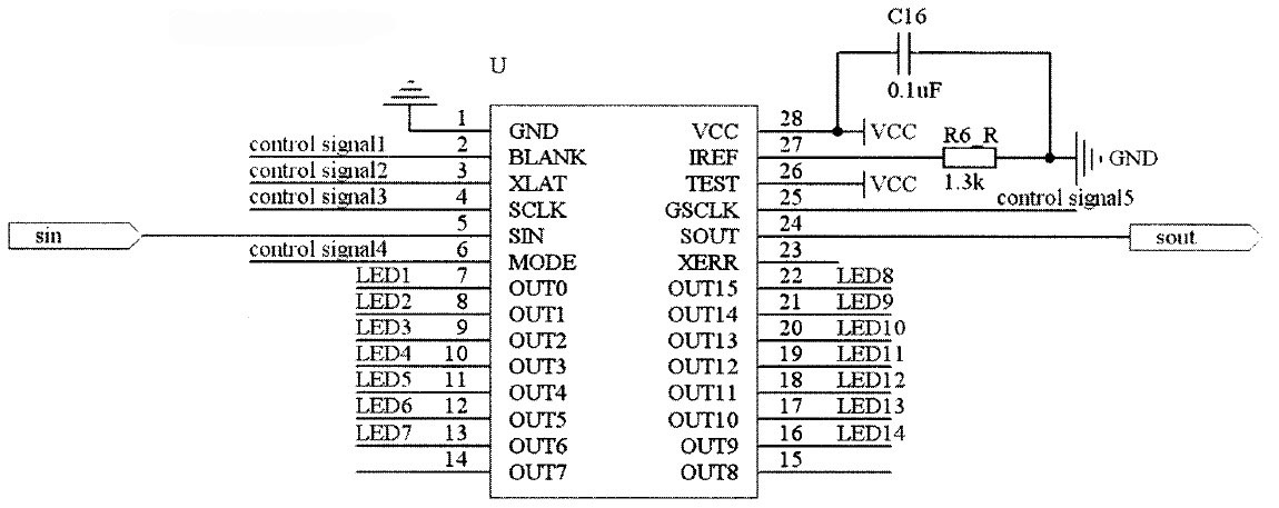 由原理图3可以看出,电源电路给TCL5941芯片提供电源的同时给LED灯组提供点亮电压。控制信号给TCL5941提供控制信号,TCL5941根据接收到的控制信号的要求对LED的亮度进行控制。