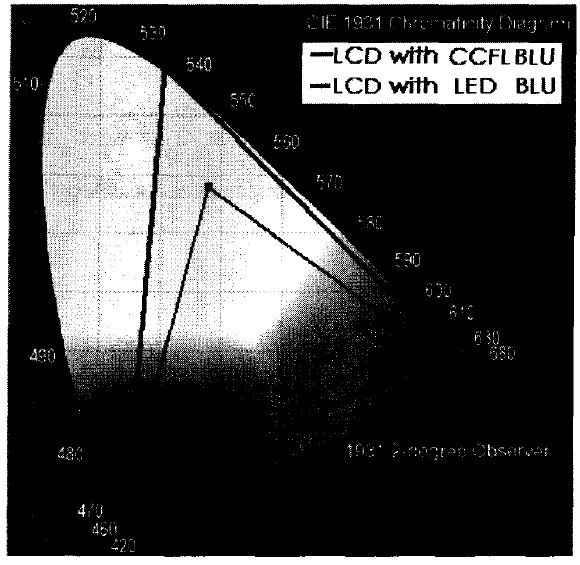 目前,以CCFL作为背光源是液晶电视的主流。但是CCFL存在一个本质的缺点,即能够达到的色域(即电视机的色彩表现范围)较小,普通的CCFL一般只能够达到NTSC(美国国家电视系统委员会)色域标准的72% ,而且它含有汞这种有毒气体,不符合绿色环保的要求。