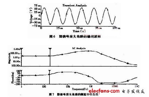 运行Analysis下的ACAnalysis,得到如图7所示的频率特性曲线。从该图中我们可以看到该放大电路在中低频率情况下幅频特性和相频特性都比较平稳。通过拖动标尺,可以得到该电路的带宽约为300Hz。