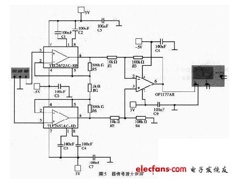 根据仪表放大器的原理,设计出利用TLC2652构成的弱信号放大电路如图5所示。