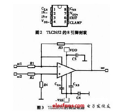 TLC2652的典型电路如图3所示,构成差分放大电路。
