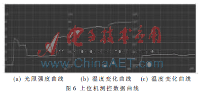 为了验证系统参数的动态变化性能,在实验过程中人为地对各相应的传感器进行了遮挡、加热、加湿等干扰,从实验结果上看这些干扰都很及时地在上位机监测界面中有所反映,监测界面的右下角实时显示当前数据变化值, 实验监测界面图如图6所示,显示数据曲线呈跳跃式变化正好说明了系统响应速度快,在很短时间内可以采集环境参数的变化。