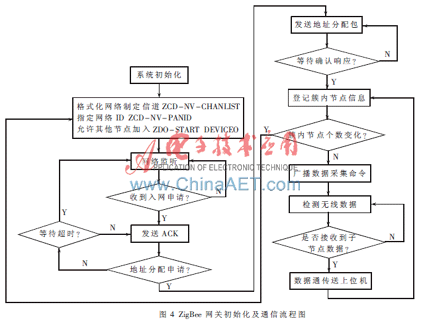 ZigBee网关向下管理无线传感器测控网络各个终端节点, 向上连接实现和上位机数据中心交互功能, ZigBee网关初始化后首先格式化网络并选择信道,建立新的网络,允许其他节点加入网络并分配网络ID,广播数据采集命令等[6],程序流程图如图4所示。