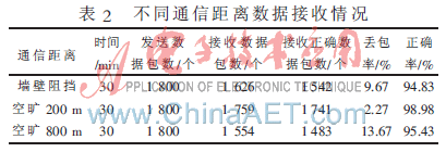 为了测量数据采集通信终端的丢包率和正确率,分别选取叠加厚度为70 cm的墙壁和空旷地带进行了实验。测试结果如表2所示。