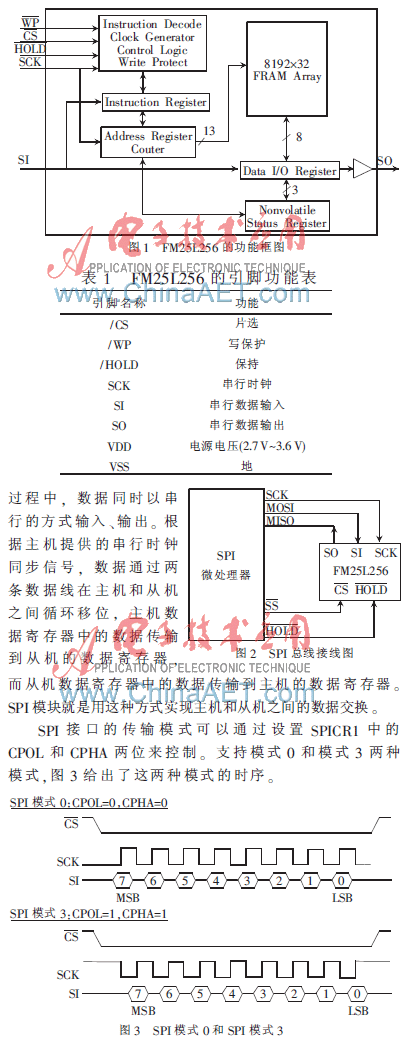 FRAM可以像RAM一样以总线速度完成读写操作,由于不是用电荷来存储数据而是工作在极化状态,所以在写入数据后无需等待,没有写操作延时,同时还可以像传统非易失性存储器一样提供非易失性的存储功能。可以保存数据达10年以上,使用起来更加简捷,提高了系统的可靠性。与高速RAM相同,支持几乎无限次的读写循环操作。这些优点使得将RAM的功能和ROM的技术结合在一个芯片中[2]。FM25L256的功能框图如图1所示,引脚功能表如表1所示。