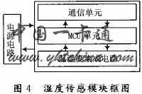 湿度传感模块采用数字集成电路SHT11,其性能特点是:将温湿度传感器、信号放大调理、A/D转换、I2C总线接口全部集成于一块芯片上(CMOSensTM技术);湿度传感模块框图如图4所示。