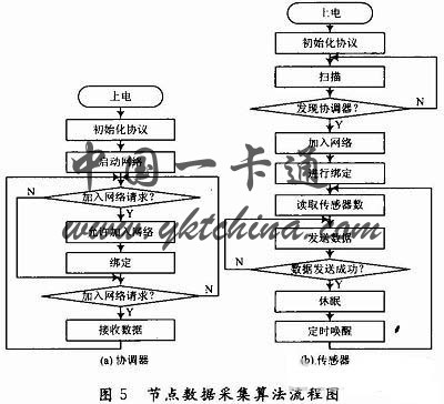 首先上电初始化整个系统,启动协调器建立一个新的网络,路由节点和传感器节点寻找并加入网络,协调器即可与终端节点进行绑定。绑定完成后传感器节点即可采集数据并发送数据,收集节点负责接收数据,并通过RS 232传至PC显示。图5为协调器和传感器节点的数据采集算法流程图。