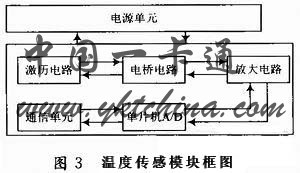 温度传感模块的核心元件为Pt100铂电阻,它是正温度系数热敏电阻传感器,线性较好,在0~100℃之间变化时,最大非线性偏差小于0.5℃。另外,Pt100温度传感器还具有抗振动、稳定性好、准确度高、耐高压等优点。模块框图如图3所示。