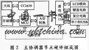 本文总体硬件设计是实现针对主协调器节点的设计与开发。主协调器的硬件系统中包括CC2430通信模块、键盘电路模块、串口转USB模块、液晶显示模和电源电路模块等。主协调器节点的主要功能是负责接收和存储传感器节点发送来的消息,并向传感器节点发布网络控制信息,同时与Pc机进行数据交换。其中串口转USB模块负责转换CC2430模块与PC机的通信信号;液晶显示模块负责节点工作状态的指示;电源模块通常采用持续电力供电,为主协调器节点提供运行所需的能量。根据气象采集系统的需求设计硬件结构,并设计各部分电路,包括无线传输模块、CC2430接口模块、复位电路模块、电源电路模块、数据采集模块、扩展电路模块及外围电路。如图2所示为主协调器节点硬件组成图。