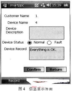 RFID信息的采集由阅读器(Reader)与电子标签(TAG)及应用软件系统3个部份组成,该巡检仪结合提供的RFID应用软件开发出适合Pocket PC的RFID信息采集软件,该软件包括终端信息显示界面和巡检数据录入界面。终端PS信息显示则是以表格的形式显示给用户,包括是否完成、序号、设备ID、设备名称、操作人信息等。由于每个巡检对象上都装有电子标签,通过Pocket PC安装的RFID阅读器,自动将信息扫面进终端数据库,并可激活信息采集软件,根据阅读到的具体ID信息进入相应的巡检数据录入界面。巡检数据录入则是记录数据的关键,主要有两部分组成,即Device Status记录巡检对象故障和正常、Device Record记录该设备的详细说明,如图4所示。